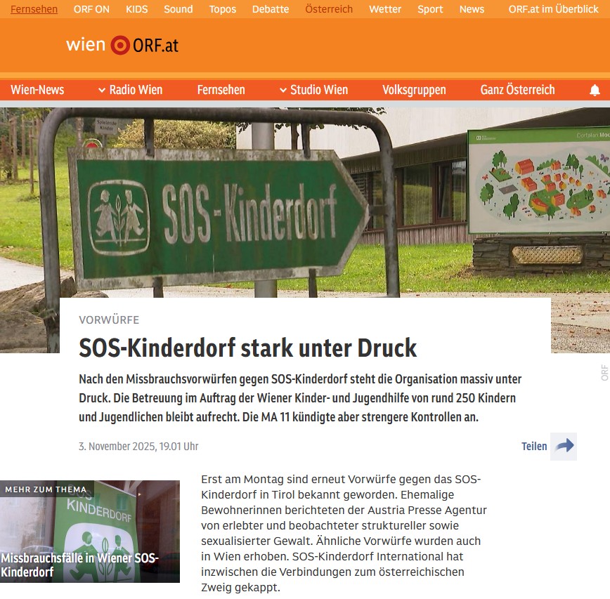 Erst am Montag sind erneut Vorwürfe gegen das SOS-Kinderdorf in Tirol bekannt geworden. Ehemalige Bewohnerinnen berichteten der Austria Presse Agentur von erlebter und beobachteter struktureller sowie sexualisierter Gewalt. Ähnliche Vorwürfe wurden auch in Wien erhoben. SOS-Kinderdorf International hat inzwischen die Verbindungen zum österreichischen Zweig gekappt.